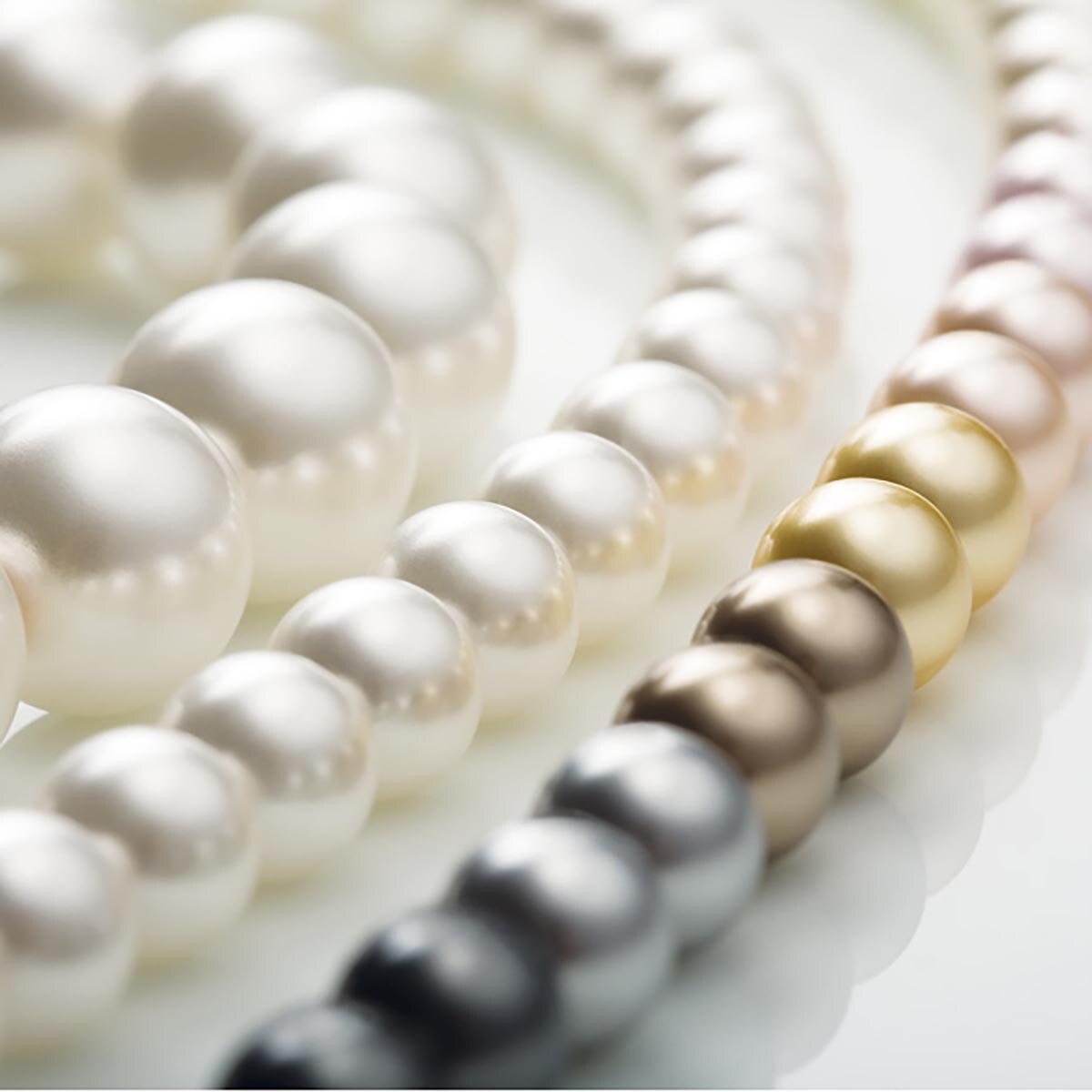 Their luxurious shimmer is achieved by using a unique coating technology over the crystal core. The pearl-like layers are then applied evenly to the core which ensures harmonious tones and colour matching. The surface finish is consistent and gently reflects light to create an irresistible appeal. They are resistant to wear, the sun's rays, perspiration and perfume to retain their shimmer for a very long time.